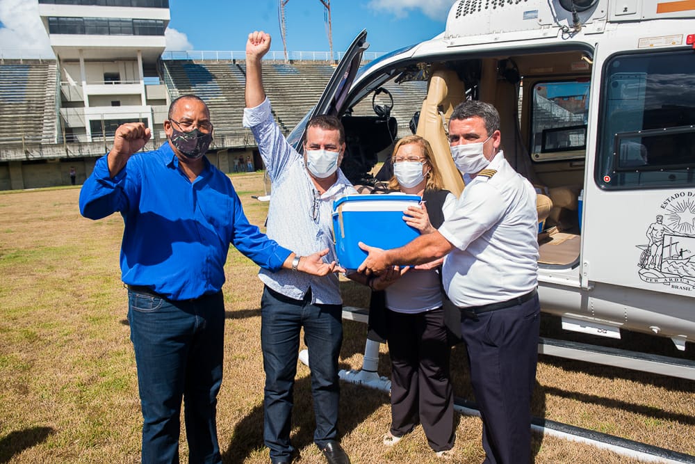 As 200 doses destinadas aos profissionais da área de saúde chegaram no helicóptero do Grupo de Rádio Patrulhamento Aéreo (GRAER), no estádio municipal e foram escoltadas pelo corpo de bombeiros e pela Polícia Militar até a Secretaria Municipal de Saúde (SESAU), onde será armazenada até o início das aplicações.