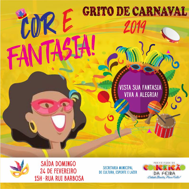 A Prefeitura Municipal de Conceição da Feira, através do Prefeito Raimundo Bastos, o popular Pompilio, e a Secretaria de Cultura, do secretário Emerson Inho, promovem o grande grito do Carnaval 2019.