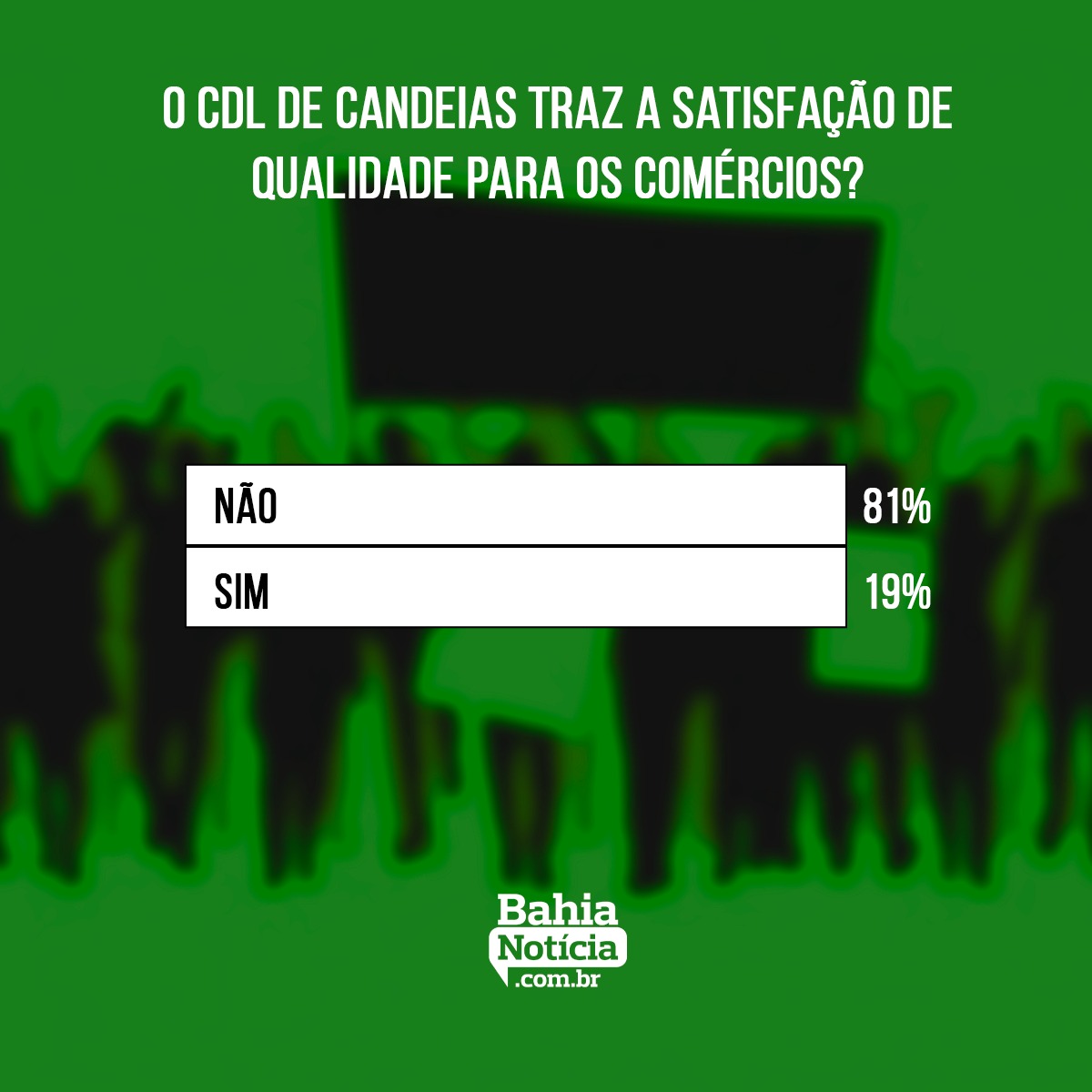 Bahia Notícia realizou enquetes de avaliação na página do Facebook (40.000 seguidores). A primeira foi para saber o que eles acham da atuação da CDL de Candeias e o resultado foi 81% não estão satisfeitos e 19% estão satisfeitos. Isso mostra que o trabalho atual da CDL não tem agradado a grande maioria comerciantes e empresários do município que se sentem sem incentivo por esse órgão.