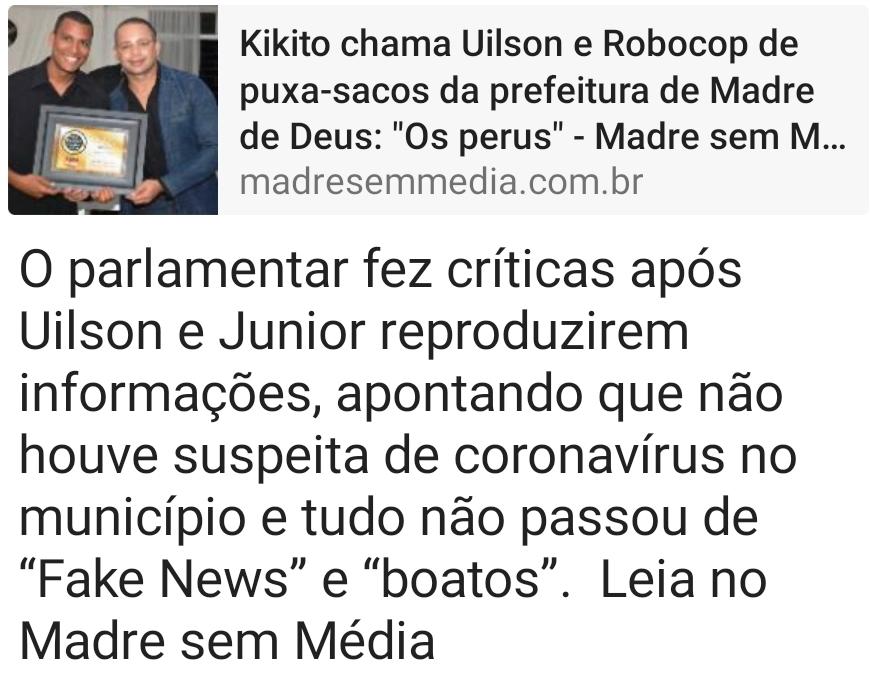 O blog citou que os comunicadores que são de Candeias chegaram em Madre de Deus para distorcer as palavras deles. As inverdades dos blogueiros e raiva foi que o nosso papel de comunicadores é ir com a seriedade e verdades. O episódio onde alguns blogueiros da região ao tentar atacar o grupo político do município espalharam uma onda de Fake News como se uma jovem da capital tivesse ido a óbito por conta do Coronavírus e o hospital havia negado atendimento. Duas mentiras espalhadas que poderiam ter causado a maior confusão na região caso os moradores dos municípios da região metropolitana tivessem dado credibilidade aos blogueiros irresponsáveis.