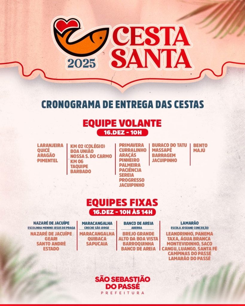A Prefeitura Municipal de São Sebastião do Passé, através da Secretaria de Assistência Social, realizará, nesta quarta (16) e quinta-feira (17), a entrega da Cesta Santa, kit de alimentos oferecido a famílias em situação de vulnerabilidade, nesta Semana Santa.