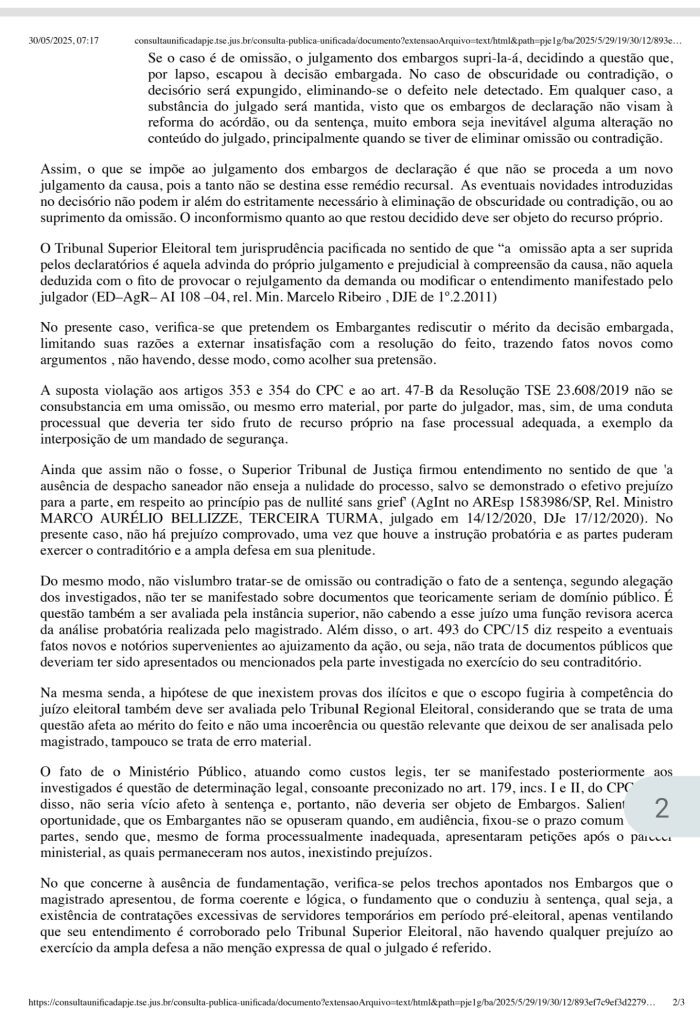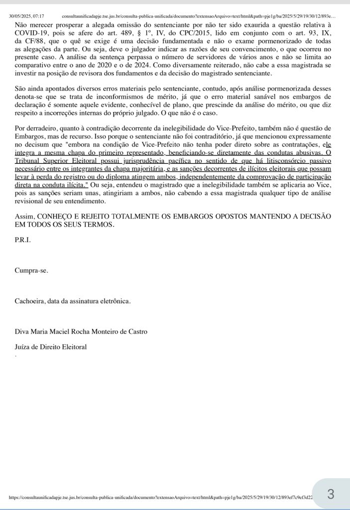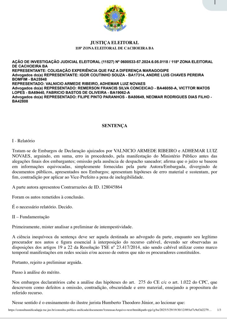 Em uma decisão que promete agitar o cenário político de Maragogipe (BA), a Justiça Eleitoral rejeitou, de forma definitiva, os embargos de declaração apresentados pela defesa do prefeito Valnício Armede Ribeiro e do vice-prefeito Adhemar Luiz Novaes. A decisão foi proferida pela juíza Diva Maria Maciel Rocha Monteiro de Castro, que reafirmou a inelegibilidade do vice-prefeito e reforçou a fragilidade dos argumentos utilizados pelos advogados na tentativa de reverter a sentença anterior.