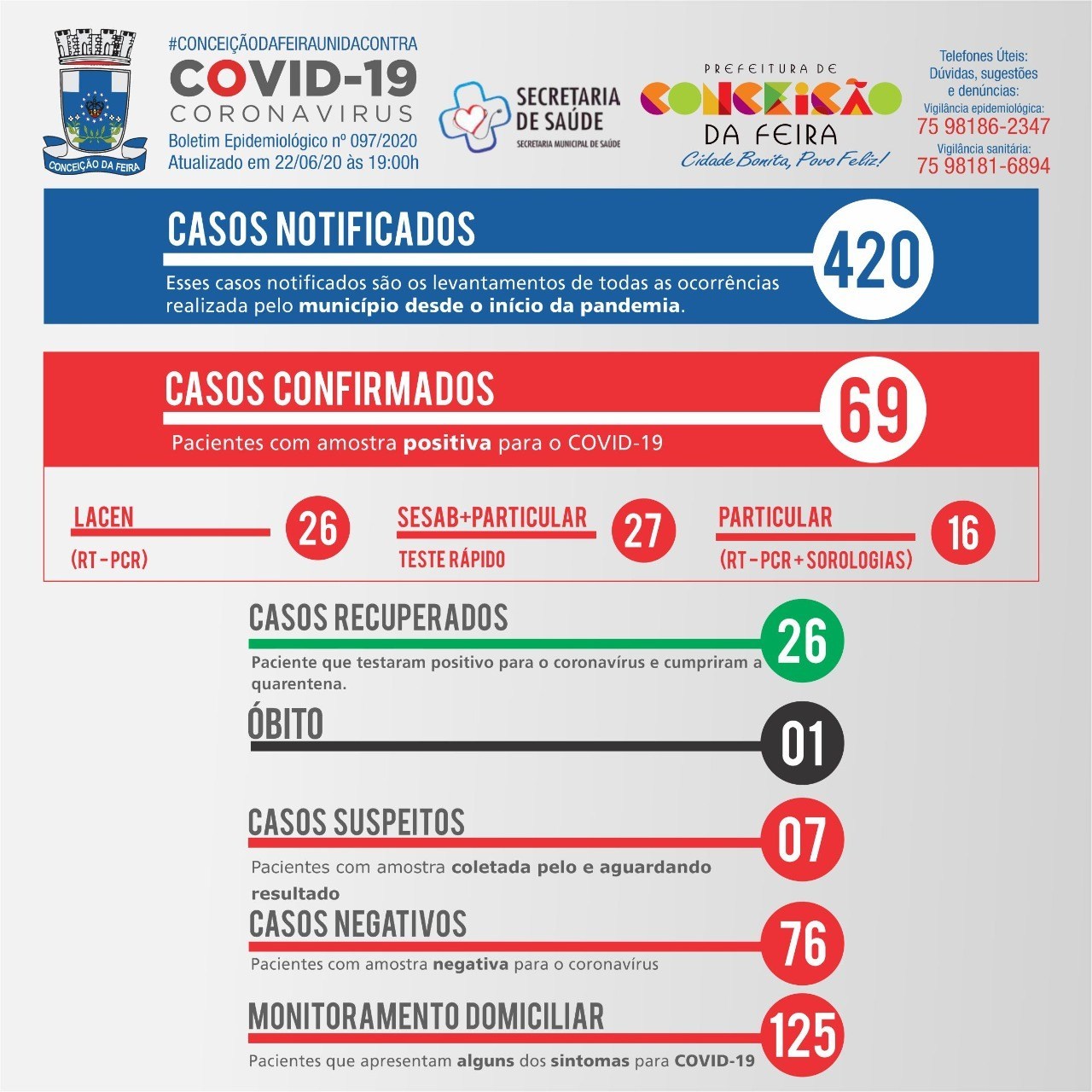 A cidade de Conceição da Feira tem 69 casos confirmados do Coronavírus. Segundo o boletim epidemiológico divulgado neste domingo (20). Segundo informações, 420 casos foram notificados, 26 pessoas foram recuperadas, 07 casos suspeitos, 76 casos negativos e 125 pessoas em monitoramento domiciliar e 1 óbito.