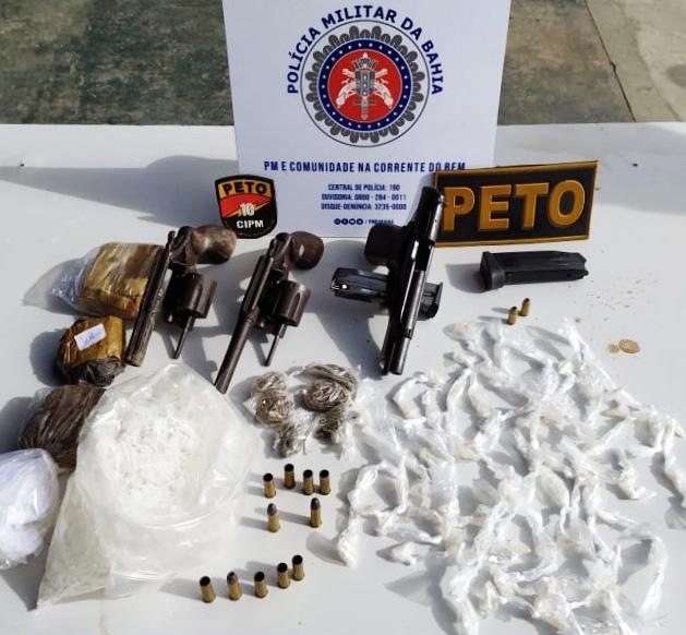 Os agentes encontraram armas, munições, 75 pinos de substância aparentando ser cocaína, oito buchas de erva, cerca de 500 pinos vazios, tablete de maconha, 100 gramas de cocaína e um carregador de pistola .45. Toda material foi apresentado na 20 Delegacia de Candeias. A polícia não apresentou mais informações sobre os suspeitos que foram baleados.