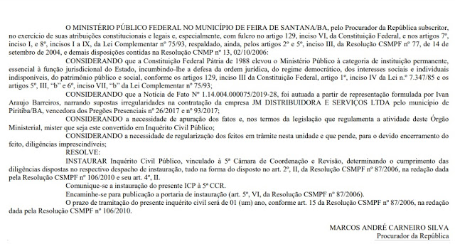 Encontra-se na 5ª Câmara, no setor de Combate à Corrupção, a denúncia de nº 1.14.004.000075/2019-28, apresentada pelo vereador Ivan Araújo Barreiros (PSDB), de Piritiba -BA. No dia 1° de abril último, através da Portaria nº 8, o Procurador da República Marcos André Carneiro Silva decidiu instaurar Inquérito Civil Público, vinculado à 5ª Câmara de Coordenação e Revisão, determinando o cumprimento de diligências dispostas no respectivo despacho de instauração.