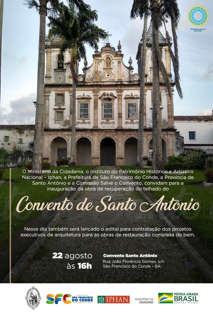 A Comissão Salve o Convento convida a você e sua família para a entrega da restauração da Igreja de São Francisco, e o lançamento da pedra fundamental para a restauração do Convento de Santo Antônio, no próximo dia 22 de agosto, 16h, em São Francisco do Conde. Você faz parte dessa história.