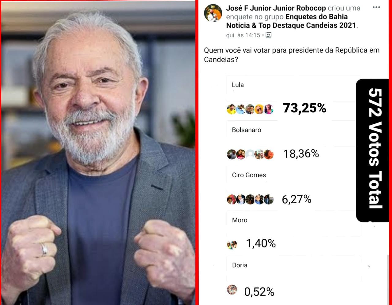 Em enquete para avaliação de votos em Candeias, referente ao mês de Outubro, no período de 48 horas na página oficial de enquetes do Bahia Notícia, para ver quem os candeenses votariam para pré-candidato a presidente do Brasil, o ex-presidente Luiz Inácio Lula da Silva venceria com 73,25%, contra 18,36% do atual presidente da República, Jair Bolsonaro.
