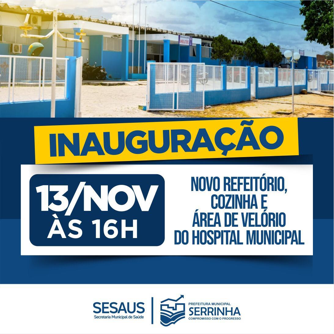 A semana começa com uma ótima notícia, na área de saúde, para os serrinhenses. Nesta quarta-feira (13), a Prefeitura Municipal, através da Secretaria de Saúde, inaugura quatro novos espaços no Hospital Municipal. São eles: a copa, a cozinha e o refeitório onde serão preparadas as refeições dos pacientes em atendimento e também dos funcionários; além de duas salas de velório.