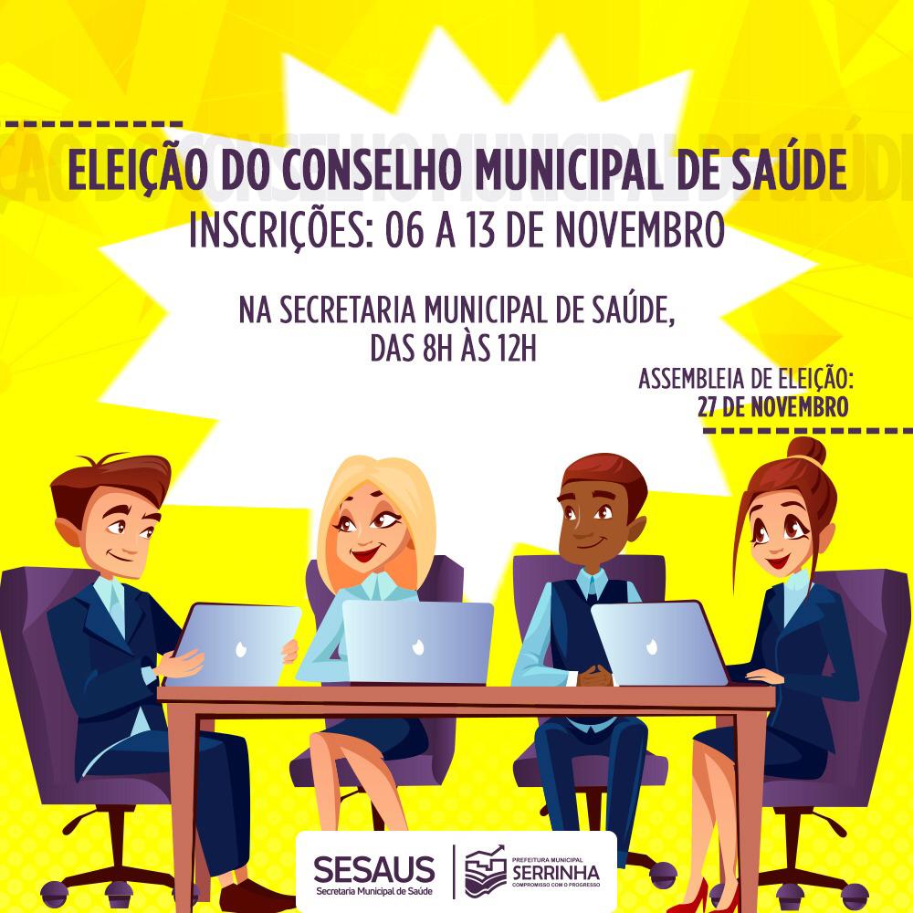 As inscrições no processo eletivo dos novos conselheiros de saúde serão realizadas de 06 a 13 de novembro, das 8h às 14h, na sede da Secretaria de Saúde, localizada na Rua Macário Ferreira, 401, Centro, Serrinha – BA.