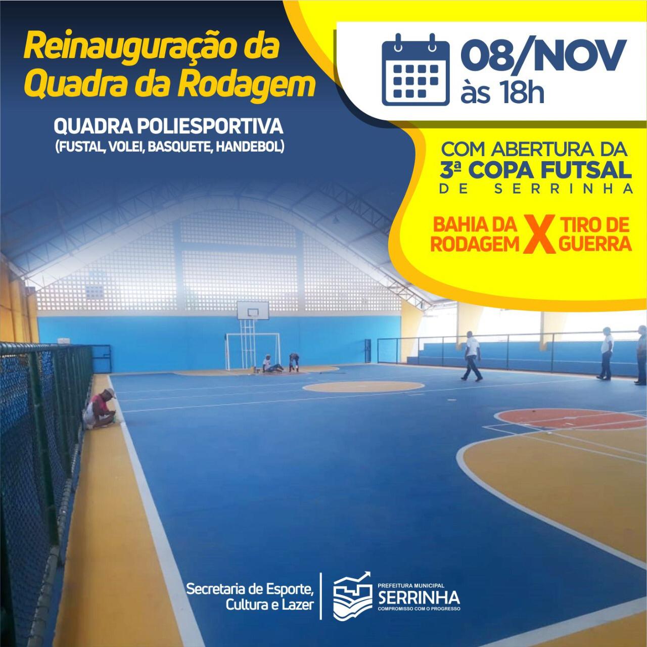 A reinauguração da quadra acontece nesta sexta-feira (08.11), a partir das 18h, com a abertura da 3ª Copa de Futsal Serrinhense, com a disputa entre os times Bahia da Rodagem x Tiro de Guerra. Antes haverá um amistoso entre integrantes da Diretoria Geral de Esportes x Câmara Municipal. A população está convidada a comparecer ao local.