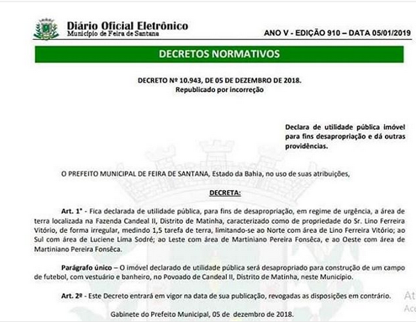 Mais uma solicitação do vereador Lulinha atendida. Foi publicado no Diário Oficial do Município, no dia 05 de janeiro, o Decreto n° 10.943, que declara de utilidade pública, para fins de desapropriação, em regime de urgência, da área de terra localizada na Fazenda Candeal II, no distrito da Matinha.